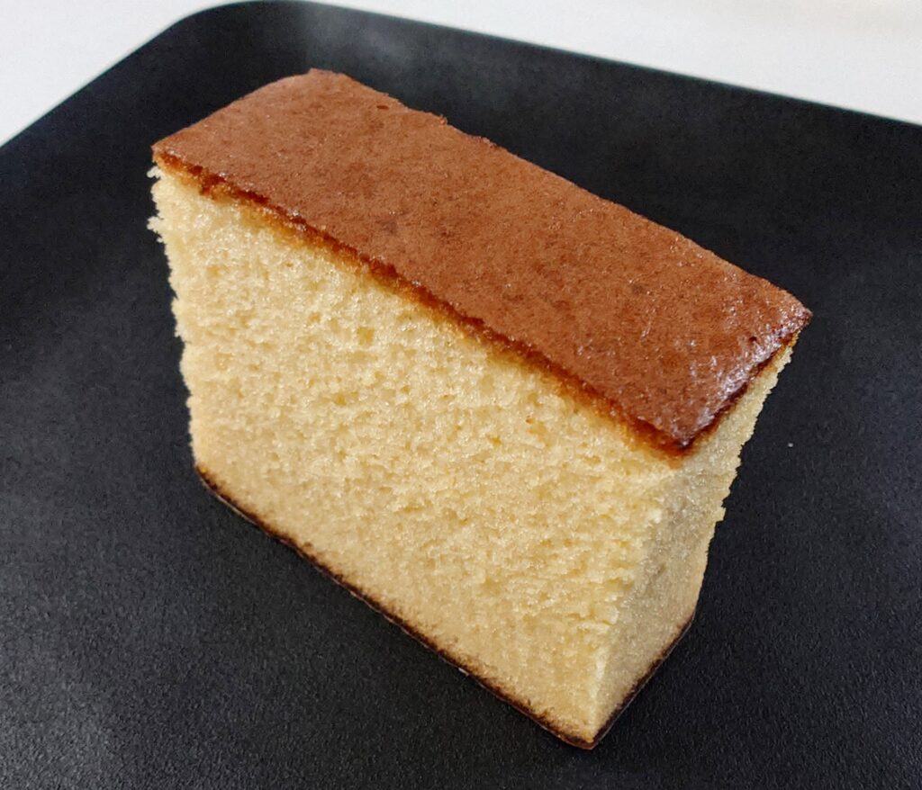 食べやすく5切れにカットされていて、見た目はいつもの文明堂のカステラ。