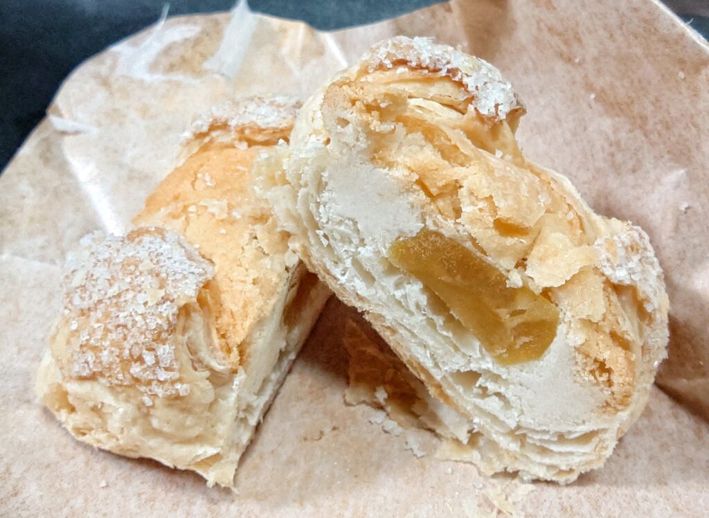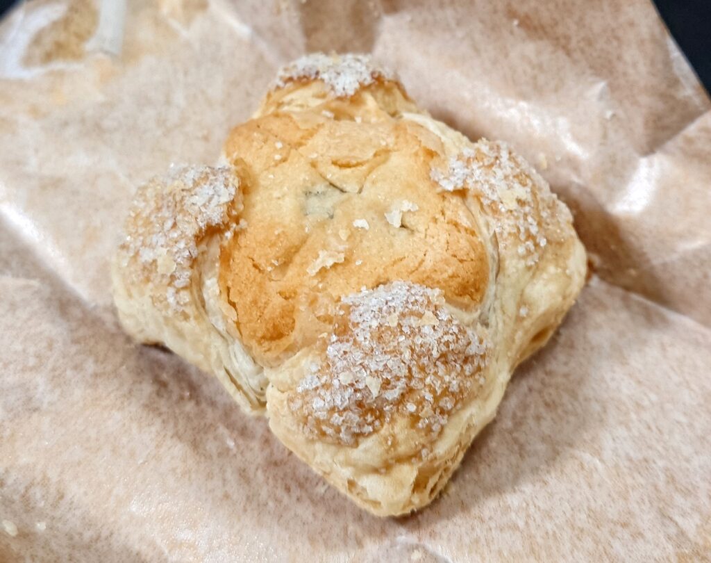 かじると、まずサクサクとしたパイ生地とグラニュー糖の甘さが広がり、洋菓子らしい味わい。